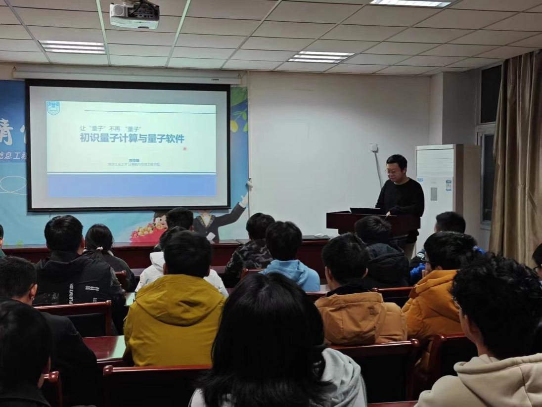 周祥臻副教授以通俗易懂的方式,从量子计算的基础概念入手,向同学们介绍了量子信息技术的基本数学原理以及在算法和信息传输方面的典型应用,引领同学们进入这个神秘而充满未知的领域。周老师重点介绍了实现量子软硬件接口的相关技术,为同学们探索量子计算领域提供了全面的视角。在量子计算产业化最新进展的分享中周老师重点讲述了当前量子计算领域所面临的机遇和挑战。同学们不仅感受到了量子计算的魅力也明确了IT青年的专业使命。