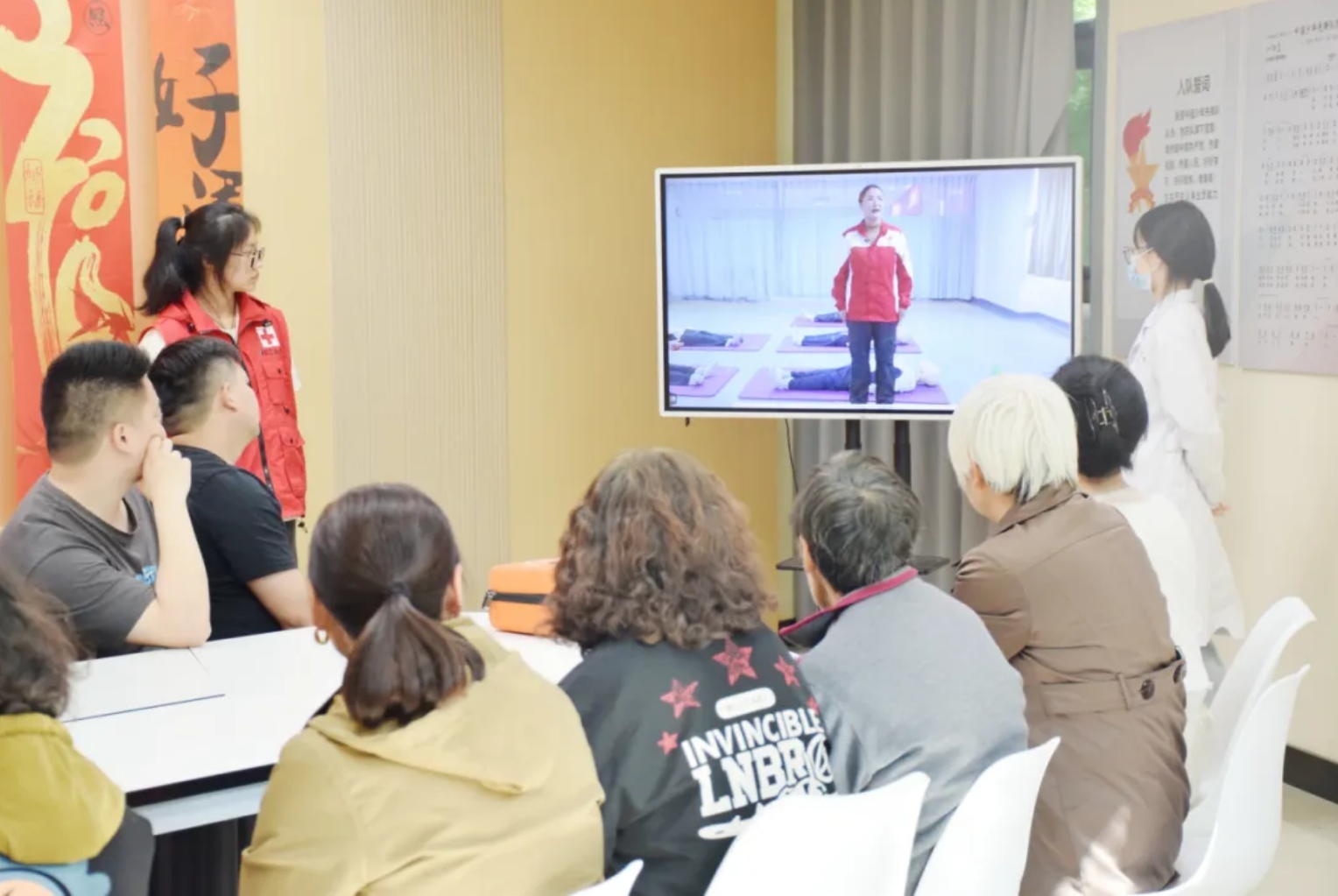 陈倩老师为社区居民细致地讲授了急救基本知识、常见突发情况的辨别和现场处理等方面的救护理论内容,主要包括心肺复苏术、AED(自动体外心脏除颤仪)操作规范、“海姆立克”急救法等方面知识,并结合中老年人多发疾病,讲解了相应的预防和应对办法。