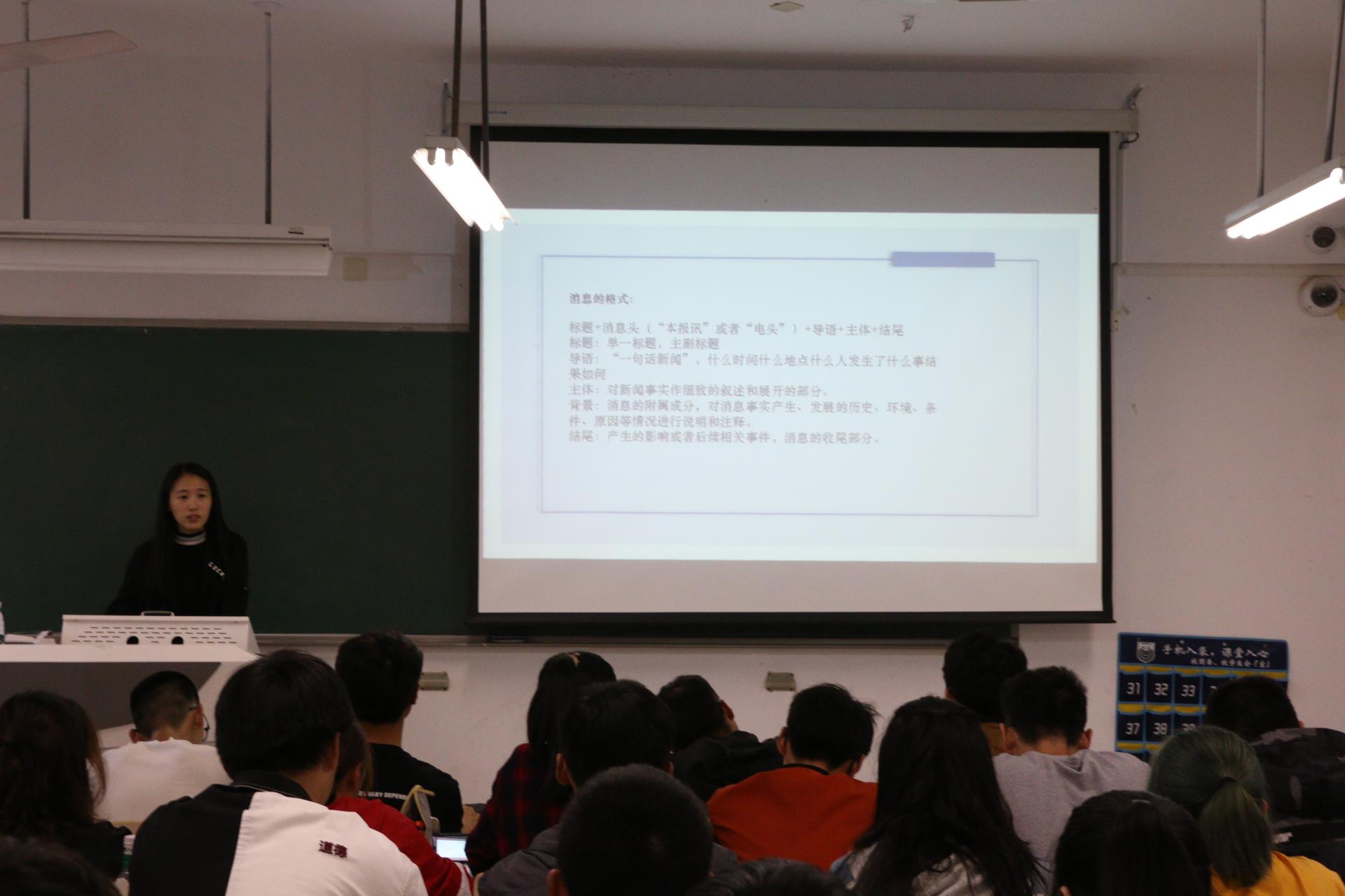 新闻宣传是用事实说话,用事实去影响读者。这既是一种报道艺术,又是一种宣传艺术。会上朱琳老师通过对比展示新闻稿的原稿以及修改版的方式,直观介绍了新闻稿写作所要注意的关于选材、格式、结构等问题,同时强调了新闻稿的相关特性,并对公司微信公众平台“信息之声”的日常运营做出了建议。接着,朱老师讲解了校园新闻摄影的要点,例如如何体现新闻本身的价值、思想和主题等,拍摄相片时的构图以及后期处理。最后,朱老师简单介绍了摄影的准备工作,提醒大家要提前到活动场地,根据实际情况来调整相机参数。