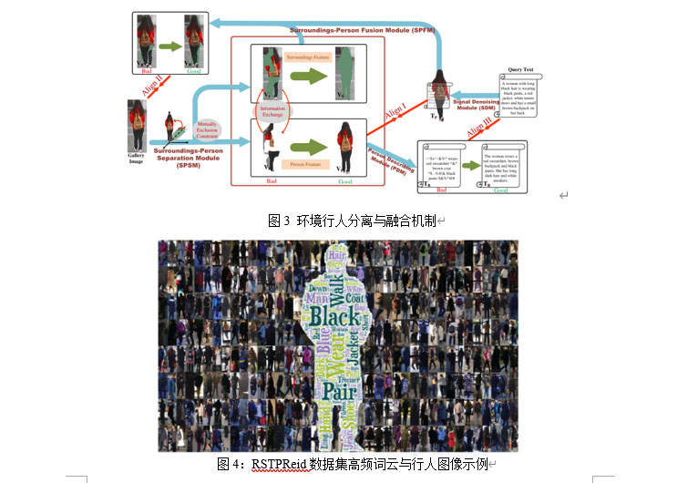 该论文针对跨模态行人重识别任务展开研究,并提出了一种深度环境行人分离学习模型(Deep Surroundings-person Separation Learning model, DSSL)。现有算法一般都致力于学习一个公共空间映射,以从异质的多模态数据中提取富有鉴别能力的特征。但由于高维数据的复杂性,无约束的映射方法很难在正确捕捉行人特征的同时剥离掉干扰信息。论文提出了一种深度环境行人分离学习模型(DSSL),以进行高效精准的行人特征提取与匹配。如图2及图 3所示,环境行人分离与融合机制(SPSM+SPFM)起到了关键性的作用,在信息正交约束下,通过行人特征的分离与跨模态融合重构匹配,从而实现精准的环境行人剥离与匹配,极大提升了模型精度。此外,为了进一步推动该课题后续研究的发展,该研究团队在MSMT17基础上,构建了一个全新的真实场景跨模态行人重识别数据集(Real Scenarios Text-based Person Reidentification dataset, RSTPReid),其中每个行人的5张图像均由不同相机在不同的时间、地点、天气、光照、视角等条件下拍摄得到。目前,该数据集发布在GitHub实验室主页上: https://ssl12399cd2175108d157588c04758296d1cfc.vpn.njtech.edu.cn/NjtechCVLab/RSTPReid-Dataset ,以供其他学者学习和使用。