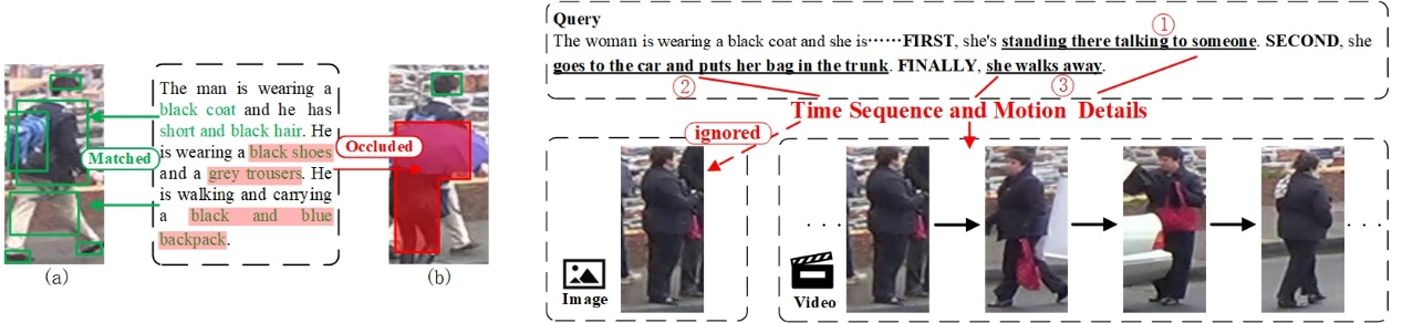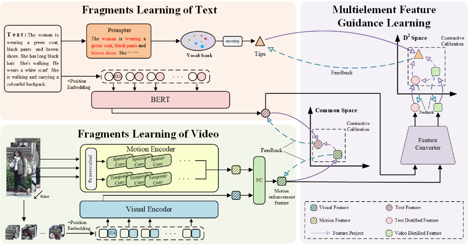 该论文提出了一个文本-视频行人检索(TVPR)新任务以及一个新数据集,并在此基础上提出了一种多元特征引导的片段化学习策略(Multielement Feature Guided Fragments Learning strategy,MFGF)。现有的大多数基于文本的人物检索方法都侧重于文本-图像的人物检索。然而,由于孤立帧提供的动态信息不足,当人物被遮挡时(如图1所示),检索性能会受到极大的影响。
