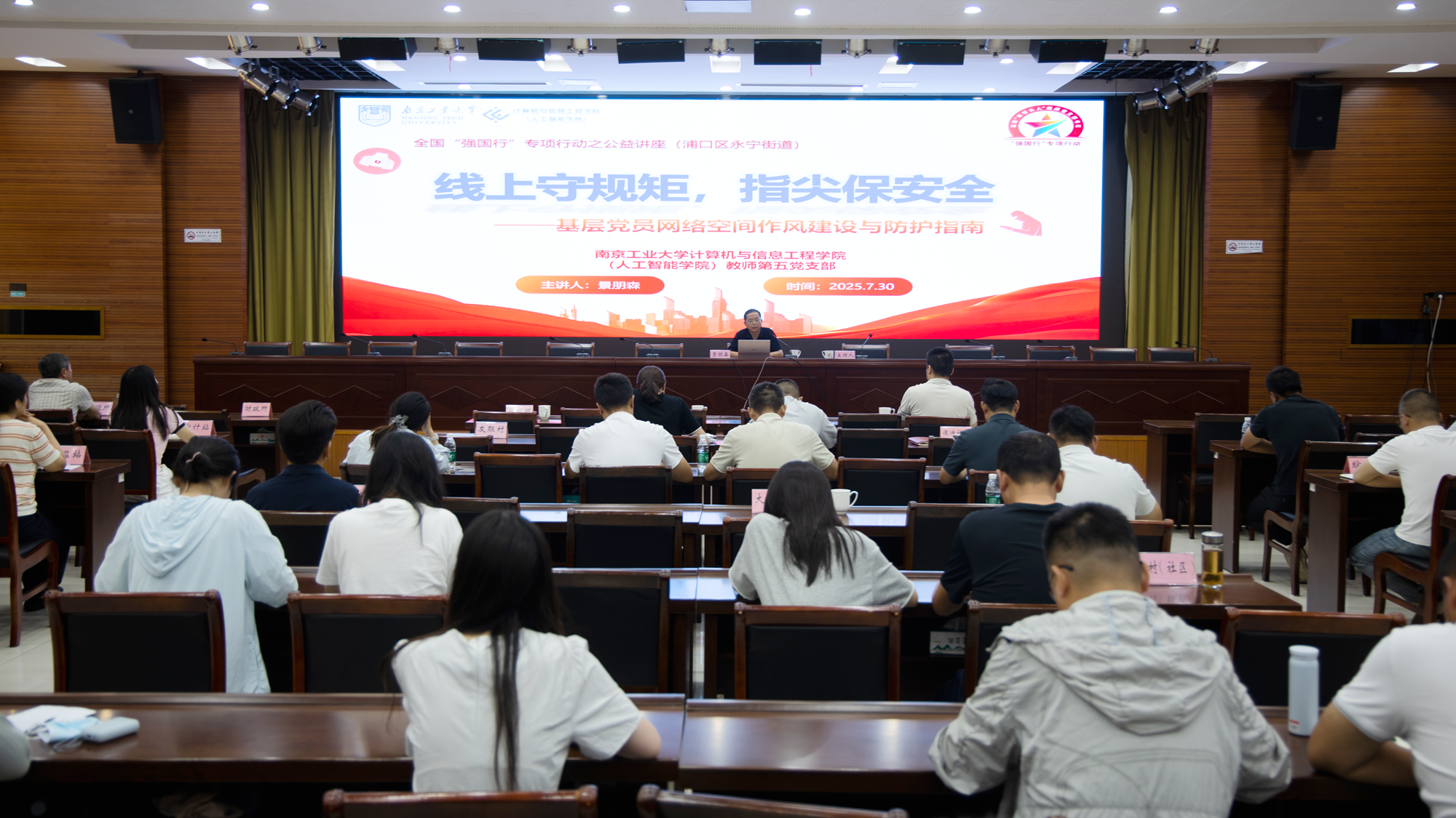 7月30日下午,应南京浦口区永宁街道党工委邀请,英国上市公司365教师第五党支部书记景朋森,在永宁街道“周三学习日”活动中,为街道领导班子成员、机关科室负责人及村(社区)书记等150余人,作题为“线上守规矩,指尖保安全——基层党员网络空间作风建设与防护指南”的专题培训。
