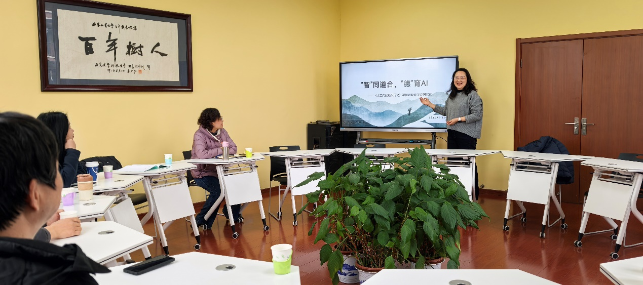 活动伊始,陈小燕老师以《人工智能导论》课程为例,作课程思政建设专题汇报。她围绕“‘智’同道合,‘德’育AI”的核心理念,从定位目标、内容方法、创新特色及成效反思四大维度展开分享。